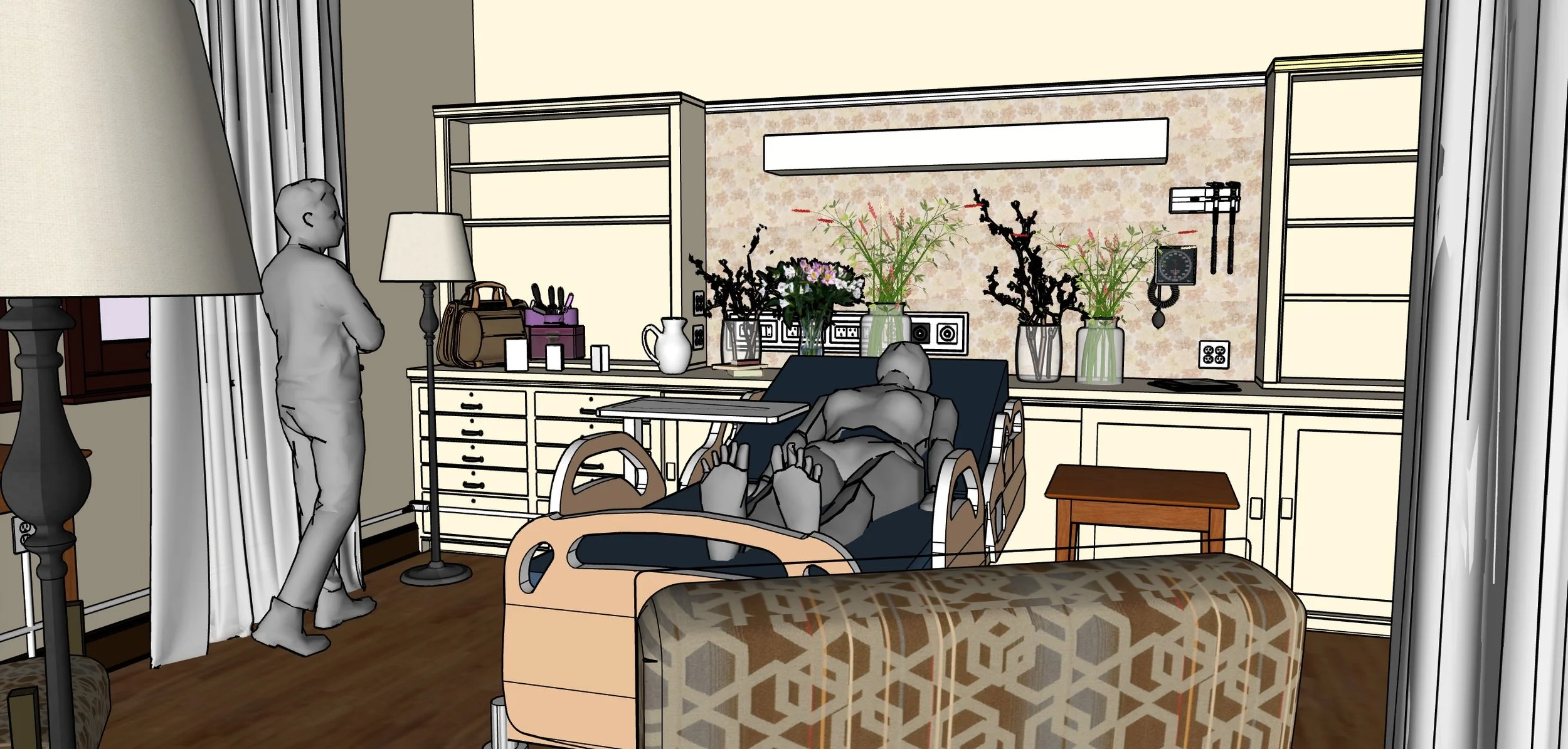 The task was to create an upscale, older hospice facility. The room was filled with objects brought in by the patient (Laurie) and her partner, revealing their social class and aesthetics. The room also needed subtle indicators of being a facility, as well as evidence of Laurie’s illness and the time passed during her stay.